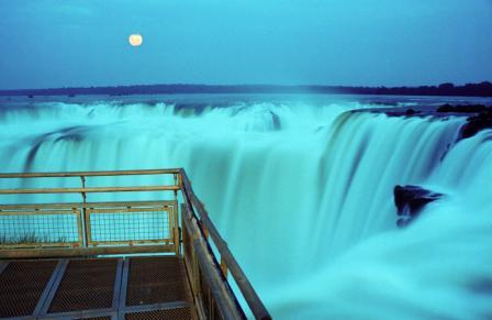 Las tranquilas aguas del río Iguazú superior, antes de caer por los saltos, forman un espejo natural con la luz de la luna llena; como un cuadro pintado por el mejor artista plástico. Desde las pasarelas, mil cien metros desde la última estación hasta el salto Garganta del Diablo, los visitantes disfrutaron de ese espejo en cada tramo del recorrido.